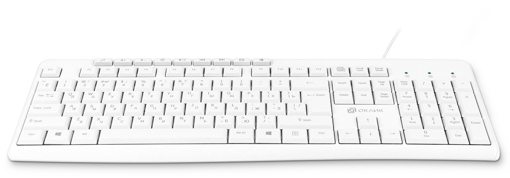 Oklick 305M – эргономичная клавиатура с корпусом в стильном белом цвете. Она подойдет для комфортной работы в офисе и дома. Модель оборудована 113 клавишами, из них 9 – вынесены в отдельный блок и предназначены для выполнения разных мультимедийных команд. Устройство отличается долгим сроком службы: выдержит до 10 млн нажатий.Благодаря продуманной конструкции пользоваться клавиатурой приятно и удобно. Влагозащитный корпус девайса не боится попадания брызг или капель напитков. Есть регулируемые по высоте ножки. Модель подключается к ПК с помощью USB-кабеля длиной 1,5 м. Клавиатура совместима с ОС Windows и Linux.