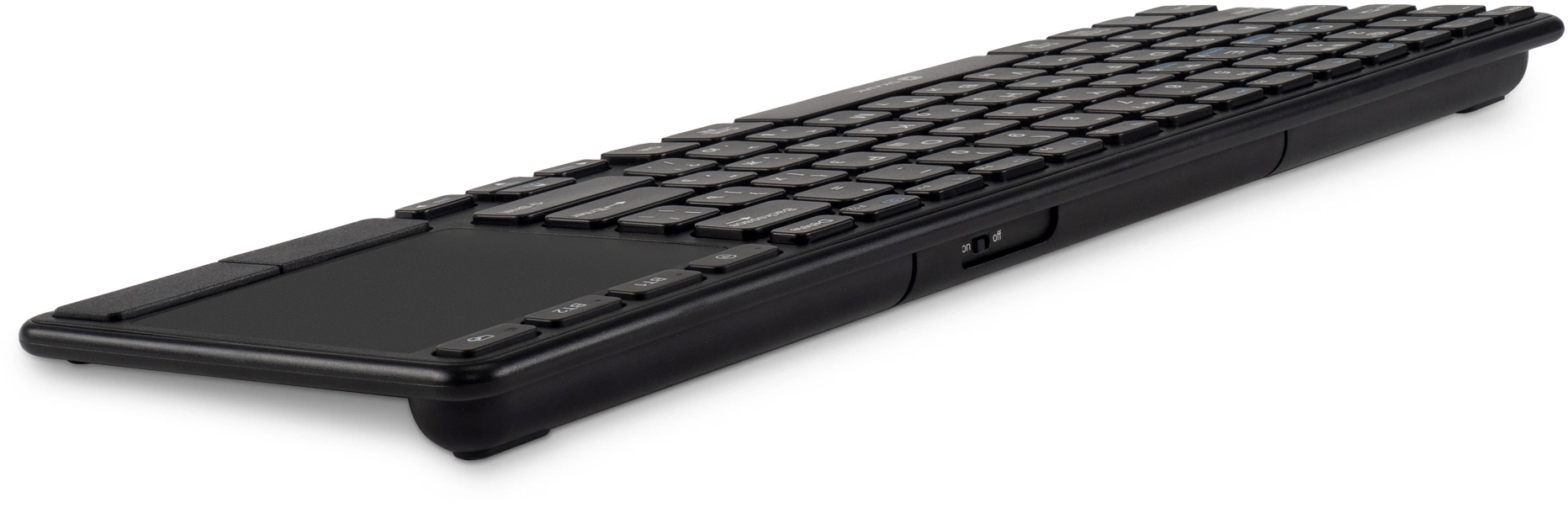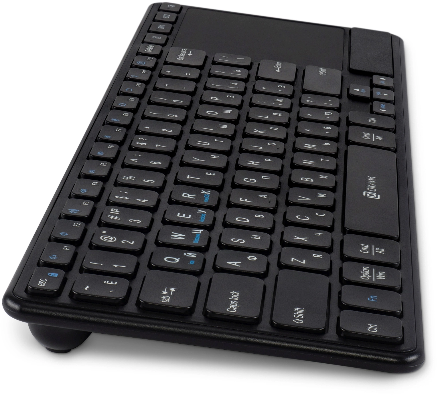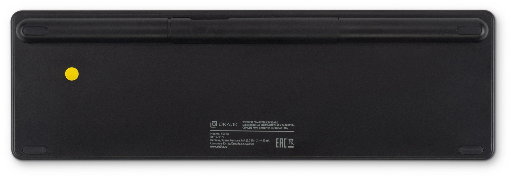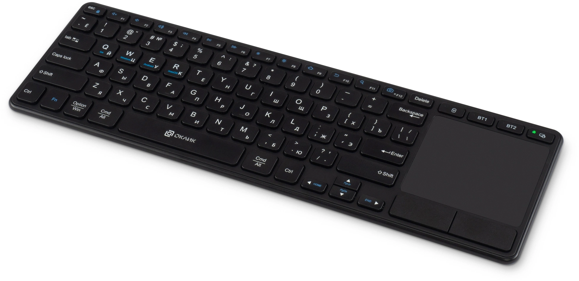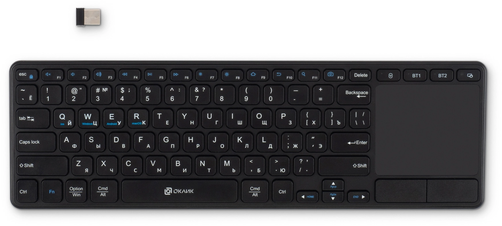 Клавиатура Оклик K614W изготовлена в форм-факторе 75%, без цифрового блока. У модели 85 клавиш, включая 14 мультимедийных и функциональных. Это привычные комбинации Fn+ F1-F12, с помощью которых можно делать скриншоты, регулировать яркость экрана, громкость звука и другие параметры. Клавиши управления стрелками совмещены с блоком Home, PgUp, PgDn и END и активируются кнопкой Fn.Клавиатура рассчитана на 5 млн кликов и пригодится тем, кто много печатает. Прорезиненные ножки не дают устройству скользить по поверхности во время интенсивного набора текста.Одна из особенностей Оклик K614W – встроенный тачпад с двумя кнопками, которые выполняют функции правой и левой кнопок мыши. Таким образом модель подойдет для Smart TV или обычного телевизора, к которому подключен ноутбук. Например, можно управлять компьютером или ТВ, сидя в кресле или на диване.Клавиатура поддерживает два режима беспроводного подключения: по радиоканалу 2,4 ГГц и по Bluetooth версии 5.0. В комплекте идет USB-ресивер с радиусом действия до 10 м. Встроенный Bluetooth поможет установить сопряжение Оклик K614W сразу с двумя совместимыми устройствами, например, планшетом и телевизором со Smart TV. Для переключения межу режимами достаточно нажать соответствующую кнопку над тачпадом.Данная модель питается от двух мизинчиковых батареек AAA, которые входят в комплект. Клавиатура совместима с ОС Windows, Mac и Linux.