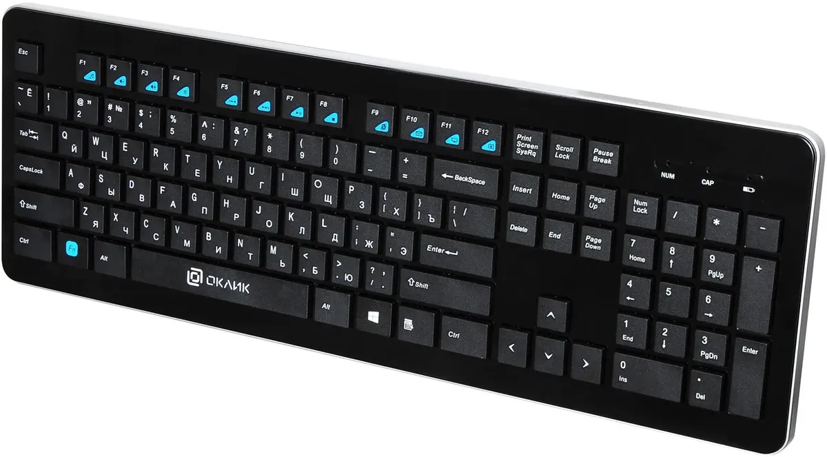 Oklick 870S – универсальная беспроводная клавиатура. Она оборудована 104 клавишами с эргономичным ноутбучным профилем для быстрого набора текста. Благодаря Slim-дизайну модель выглядит стильно и компактно. Устройство отличается долговечностью: его ресурс рассчитан на 10 млн кликов. Девайс пригодится для повседневной работы с документами, текстами и таблицами. Клавиши F1-F12 выделены голубыми иконками и помогут легко управлять мультимедийными функциями, например, мгновенно регулировать громкость звука или открывать электронную почту.Клавиатура подключается к ПК или ноутбуку по радиоканалу 2,4 ГГц, есть USB-ресивер. Питание осуществляется от двух мизинчиковых батареек AAA, которые входят в комплект. Модель совместима с ОС Windows.
