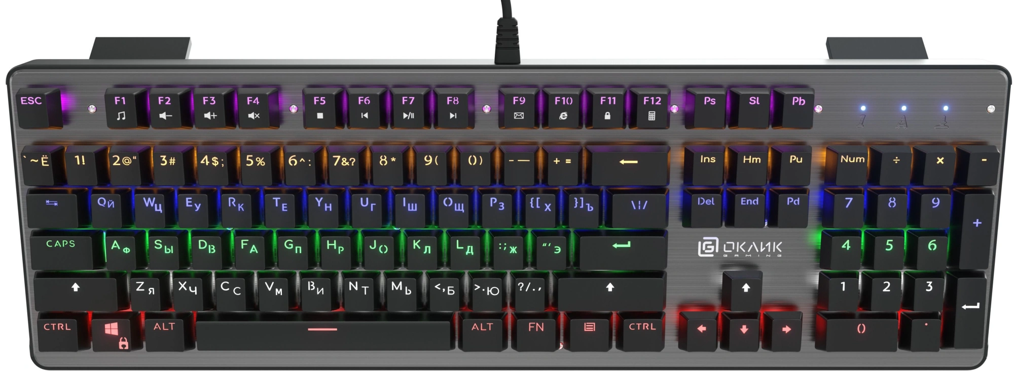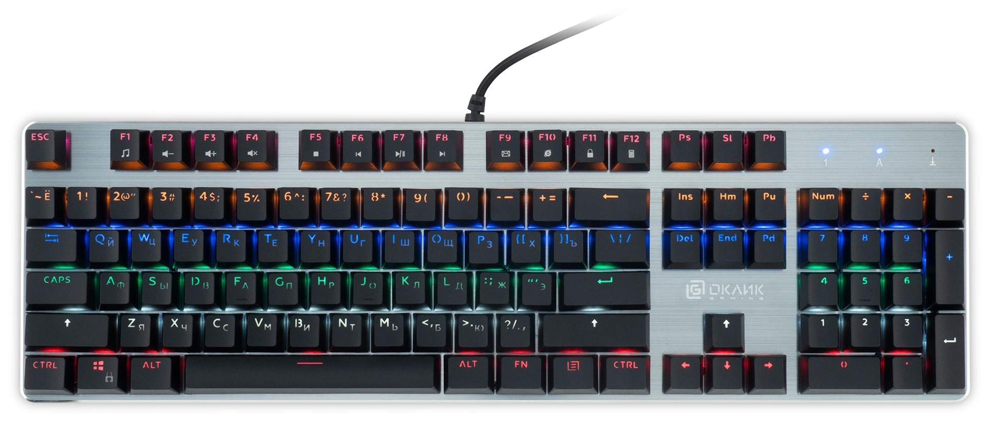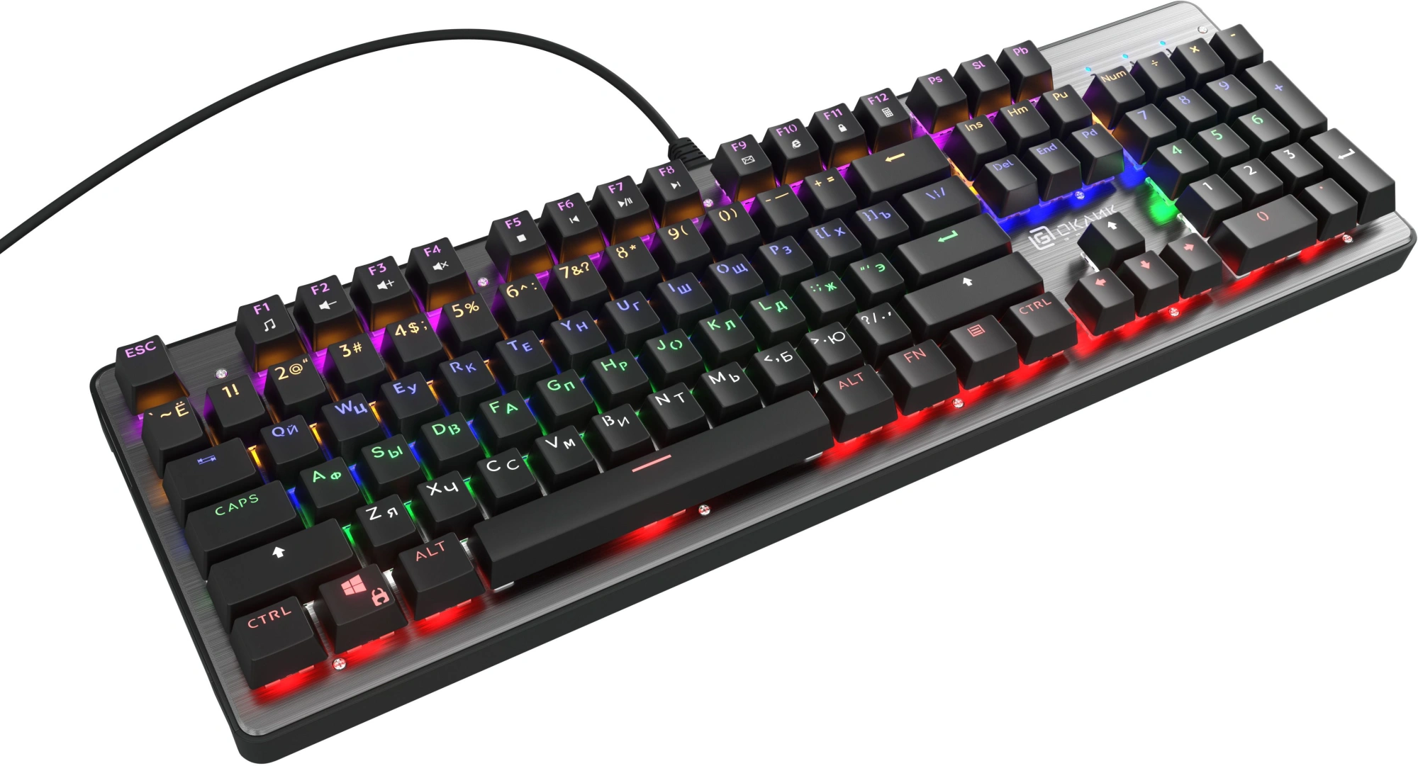 Механическая клавиатура Oklick 970G Dark Knight – выбор для тех, кто стремится к высокой производительности и комфорту во время игры.Модель оснащена игровыми переключателями Outemu Blue, которые отвечают за быстрый и точный отклик при нажатии клавиши. Игровой процесс становится более захватывающим.На клавиатуре расположены мультимедийные дополнительные клавиши, с помощью которых игрок легко управляет мультимедийными действиями и быстро реагирует в напряжённых ситуациях.Многоцветная LED-подсветка с 10 режимами помогает настроить освещение под настроение или стиль игры. Яркая подсветка создаёт уникальную атмосферу вокруг игрока.Благодаря регулировке по высоте, пользователь настраивает угол наклона клавиатуры для необходимого комфорта во время длительных игровых сессий. Эта особенность предотвращает усталость рук и запястий.Oklick 970G Dark Knight также обладает функцией ANTI-GHOSTING с неограниченным количеством одновременных нажатий, что исключает возможность "промахов" при быстром наборе текста или интенсивной игровой активности. Будьте уверены в том, что каждое действие будет точно и своевременно зарегистрировано.
