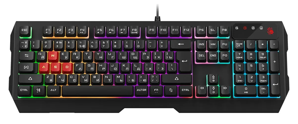 Регулируемая подсветка Эффекты подсветки: FN + F12 (постоянное свечение/ мерцание/ выкл.) Яркость: FN + ↑/↓.Б=Игровой режим Нажатие Fn+F8 деактивирует клавишу "Windows" для предотвращения случайного вылета из игровой сессии.Быстрый отклик Каждая команда будет моментально выполнена благодаря 1000 Гц технологии ультраполлинга, которая обеспечивает сверхбыстрый отклик в 1 миллисекунду.Программное обеспечение Создайте собственные макросы с помощью программного обеспечения Bloody KeyDominator, которое доступно для скачивания на bloody.com.Мультимедийные горячие клавишиНажмите FN + F1 ~ F7, чтобы применить мультимедийные горячие клавиши. Отключение звука, громкость -/+, воспроизведение/пауза, стоп, предыдущий/следующий трек.