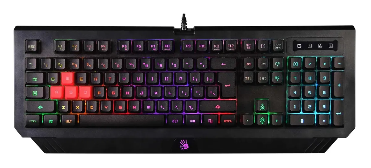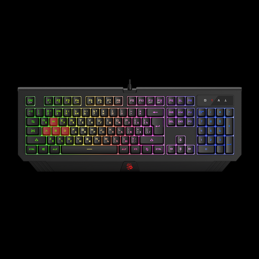 Подсветка NeonСветодиодная подсветка создает приятный визуальный эффект. Нажмите FN + ↑ / ↓, чтобы отрегулировать яркость подсветки.Быстрый откликКаждая команда будет моментально выполнена благодаря 1000 Гц технологии ультраполлинга, которая обеспечивает сверхбыстрый отклик в 1 миллисекунду.Защита от водыЭлектронно-герметичные контуры соединены с дренажными путями для большей стойкости к брызгам и разливам жидкости.Игровой режимНажатие Fn+F8 деактивирует клавишу "Windows" для предотвращения случайного вылета из игровой сессии.Частота опроса 1000 ГцЧастота опроса 1000 Гц обеспечивает более быструю обратную связь.Нескользящие ножкиПредотвращают вибрацию и скольжение клавиатуры во время игры.Поддержка ПОСоздайте собственные макросы с помощью программного обеспечения Bloody KeyDominator, которое доступно для скачивания на bloody.com.Усиленный пробелДвойные винты + двойные пружины + компенсирующая планка предназначены для большей прочности пробела.Парящие клавишиПопулярный дизайн клавиш позволяет легко чистить клавиатуру.