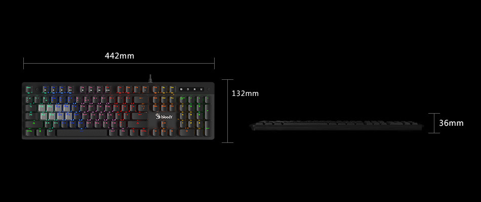 Mecha-Like переключательИнновационный запатентованный механическо-мембранный переключатель Mecha-Like Switch выполнен с использованием механизма переключателя LK (Light Strike). Он обеспечивает тактильный отклик механической клавиши и мягкий ход. Это дает ощущение на 95% схожее с использованием механической клавиатуры.5-ти зонная подсветка NeonНаслаждайтесь семицветной подсветкой и получите максимум игровых ощущений!Центрированная дизайн-подсветкаСветодиод подсвечивает центр каждой клавиши, постепенно освещая ее целиком.Быстрый откликКаждая команда будет моментально выполнена благодаря 1000 Гц технологии ультраполлинга, которая обеспечивает сверхбыстрый отклик в 1 миллисекунду.Двойная влагозащитаЗащищенная электроника + отверстие для слива воды значительно продлевает срок службы клавиатуры.Игровой режимНажатие Fn+F8 деактивирует клавишу "Windows" для предотвращения случайного вылета из игровой сессии.Частота опроса 1000 ГцЧастота опроса 1000 Гц обеспечивает более быструю обратную связь.Нескользящие ножкиПредотвращают вибрацию и скольжение клавиатуры во время игры.Поддержка ПОСоздайте собственные макросы с помощью программного обеспечения Bloody KeyDominator, которое доступно для скачивания на bloody.com.
