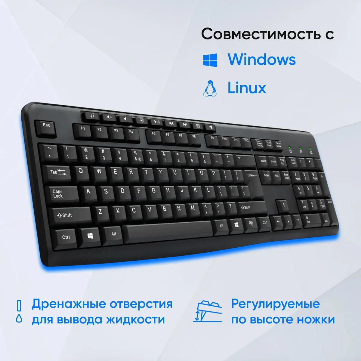 Эргономичная клавиатура с продуманной конструкцией для работы дома и в офисе. Девайс оборудован регулируемыми по высоте ножками. Дополнительные мультимедийные и офисные клавиши обеспечат быстрый доступ и управление нужными приложениями.