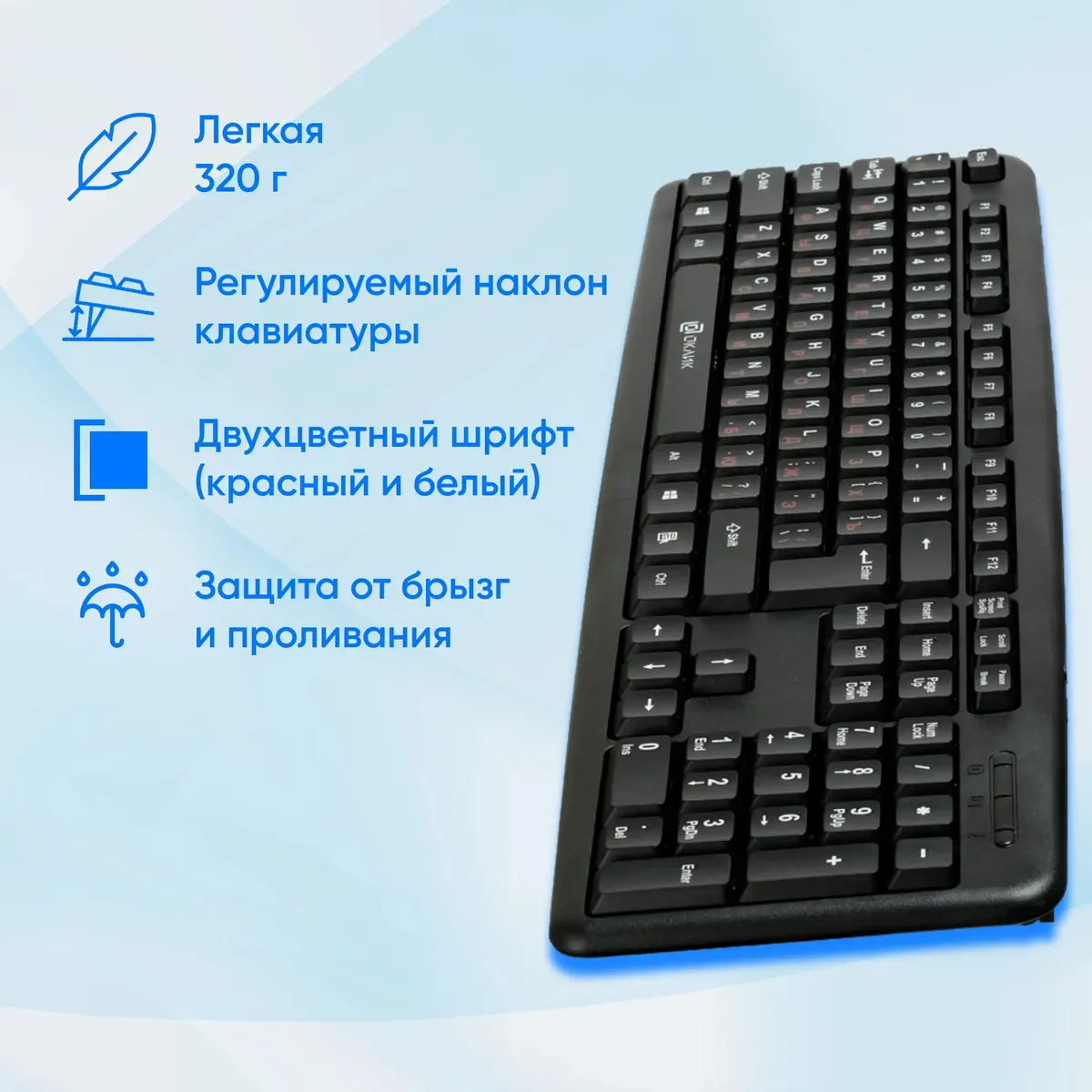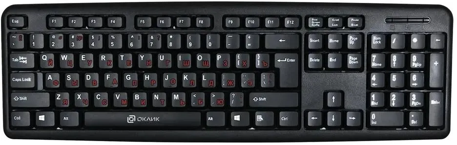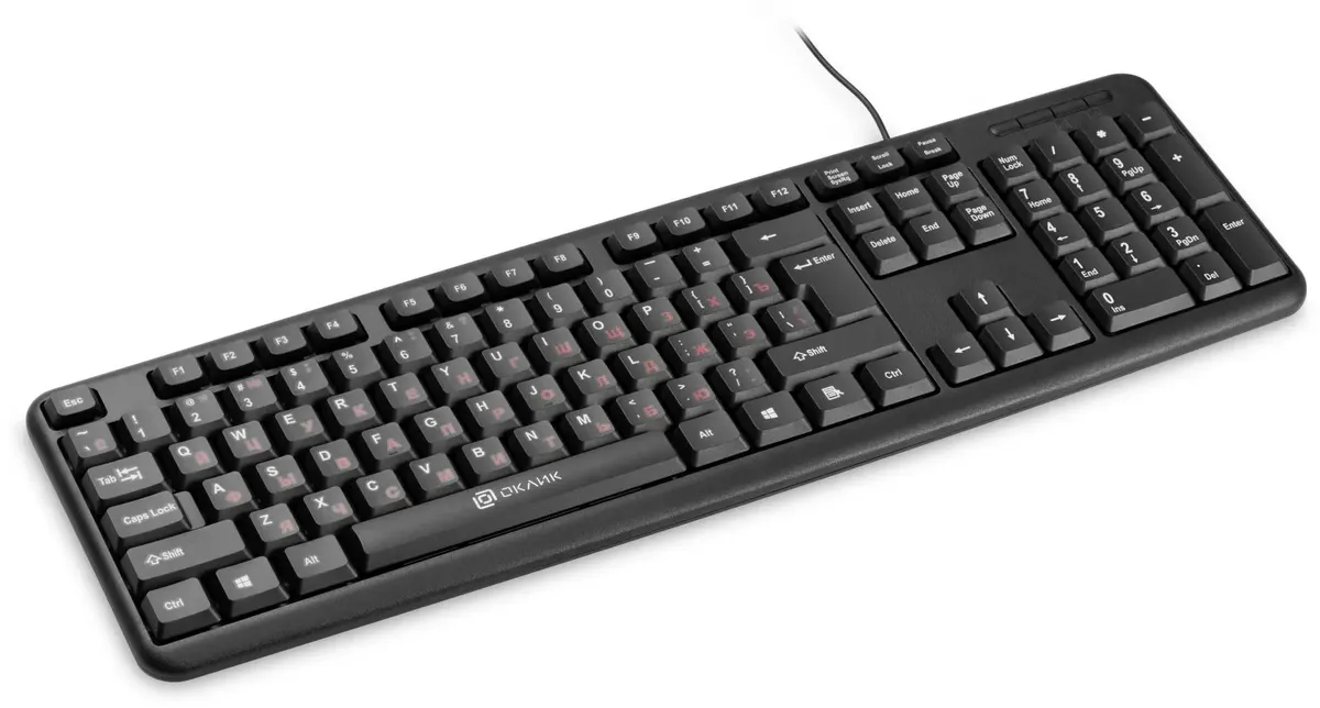 Проводная компьютерная клавиатура Oklick 90MV2 – подходящий выбор для тех, кто ценит практичность и функциональность. С ее помощью пользователь может легко и быстро работать за компьютером, не испытывая дискомфорта.Длина кабеля клавиатуры – 1.8 метра, что даёт свободу движений. Наличие цифрового блока делает использование клавиатуры удобным при работе с числами. USB-интерфейс подключения отвечает за надежное соединение с компьютером.Размер клавиатуры Oklick 90MV2 составляет 440x22x140 мм, который подходит для компактного размещения на рабочем столе. Вес устройства – 0.32 кг, так что расположение клавиатуры можно менять без труда. Классический офисный дизайн в черном цвете придает клавиатуре строгий и элегантный вид. Клавиши – квадратные. Двухцветный шрифт добавляет оригинальности: английские буквы – белого цвета, а русские – красного.