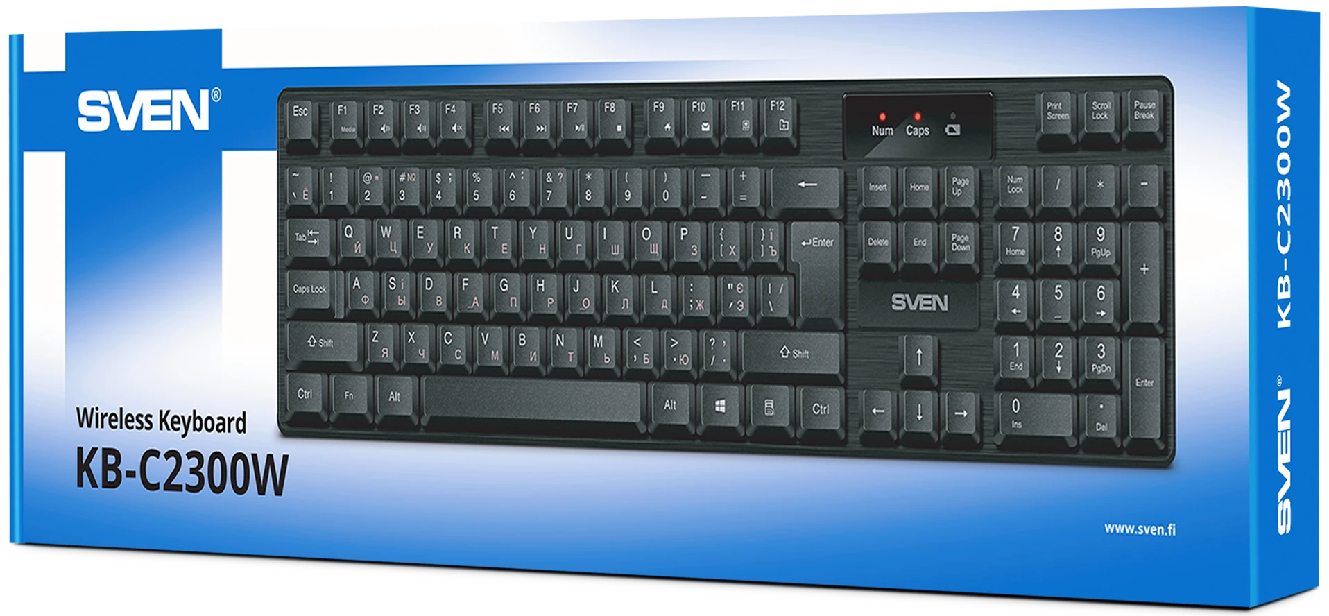 Беспроводная клавиатура SVEN KB-C2300W имеет стандартную раскладку из 104 клавиш с приятным мягким ходом. Надежная и стабильная связь с ПК осуществляется через специальный адаптер, работающий на частоте 2,4 ГГц. Высота клавиатуры может регулироваться с помощью ножек, а специальные небольшие отверстия в корпусе помогают обеспечить повышенный уровень влагоустойчивости и сохранить работоспособность устройства даже при попадании на него небольшого количества жидкости.