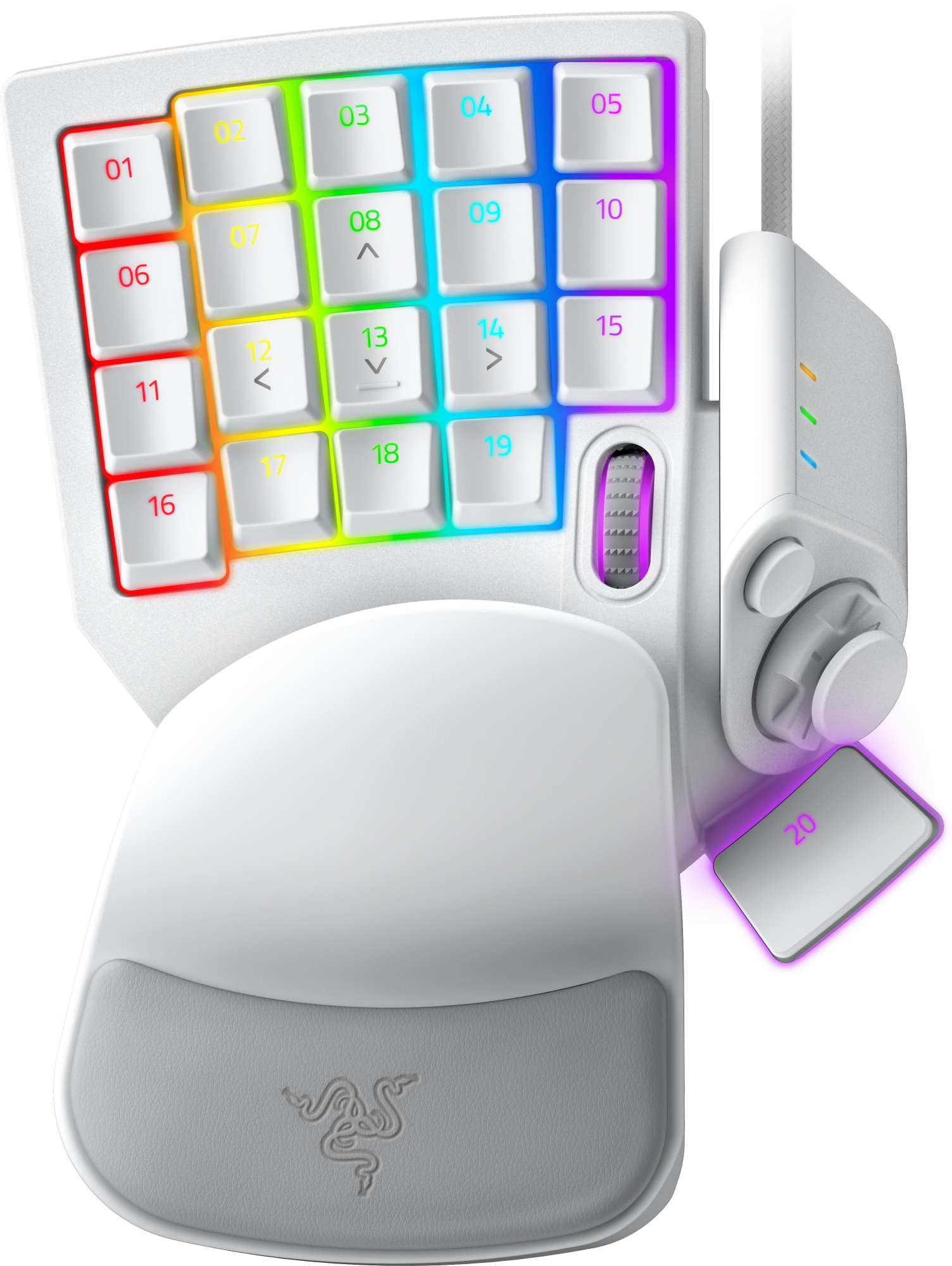 Кейпад проводная Razer Tartarus Pro Mercury – функциональная игровая модель для самых требовательных геймеров. Устройство со стильным белым дизайном оснащено 32-мя полностью программируемыми клавишами из ударопрочного ABS-пластика. Оптическая модель дополнена яркой RGB-подсветкой. Конструкция Razer Tartarus Pro Mercury оснащена удобной подставкой для запястья и длинным USB-кабелем с плотной тканевой оплеткой. Устройство с 8-позиционной крестовиной под большой палец и двухфункциональными клавишами с функцией переключения между восемью раскладками обеспечит максимально удобное и точное управление. Кейпад позволяет настраивать положение опоры для ладони, обладает регулируемым срабатыванием и неограниченной длиной макросов.