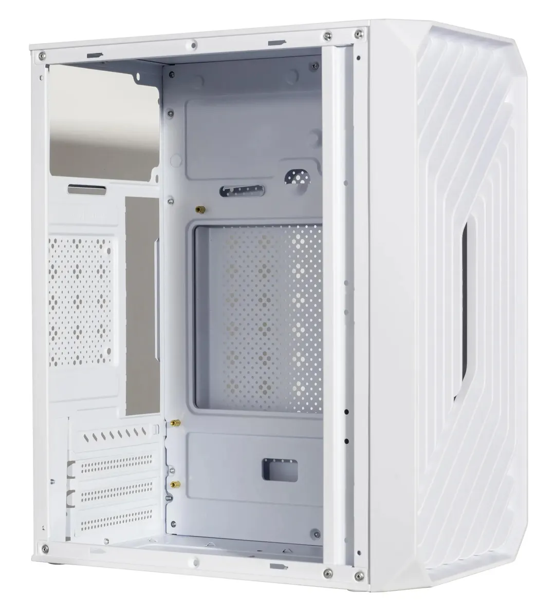 Стильный корпус в белом цвете, созданный для компактных систем mATX или mini-ITX. Поставляется без блока питания (БП) — это даёт гибкость в выборе источника питания под вашу конфигурацию. Хорошо подходит для лёгких домашних, офисных или мультимедийных сборок, где важен чистый внешний вид и минимализм.
