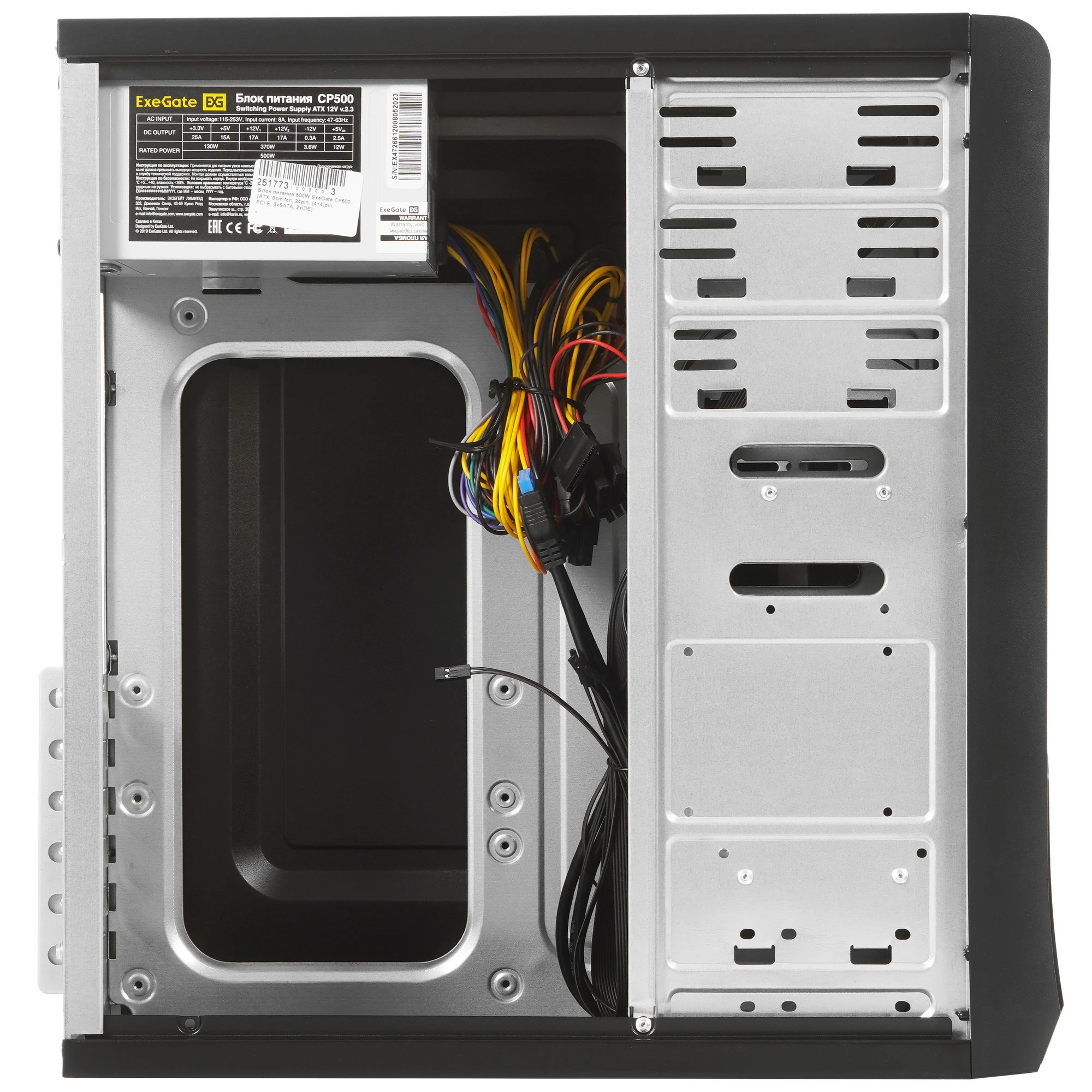 Корпус ExeGate CP-603UB-CP500 черного цвета обладает размерами 400x185x410 мм, которые соответствуют форм-фактору Mid-Tower. Устройство изготовлено из стали толщиной 0.5 мм, фронтальная панель выполнена из пластика. Поддерживается вертикальная установка материнской платы типоразмера Micro-ATX, Mini-ITX или Standard-ATX. Конструкция и габариты корпуса ExeGate CP-603UB-CP500 позволят разместить в нем видеокарту длиной до 120 мм и 140-миллиметровый кулер для охлаждения процессора. Для накопителей данных предусмотрено два внутренних отсека 3.5" и три отсека 2.5".