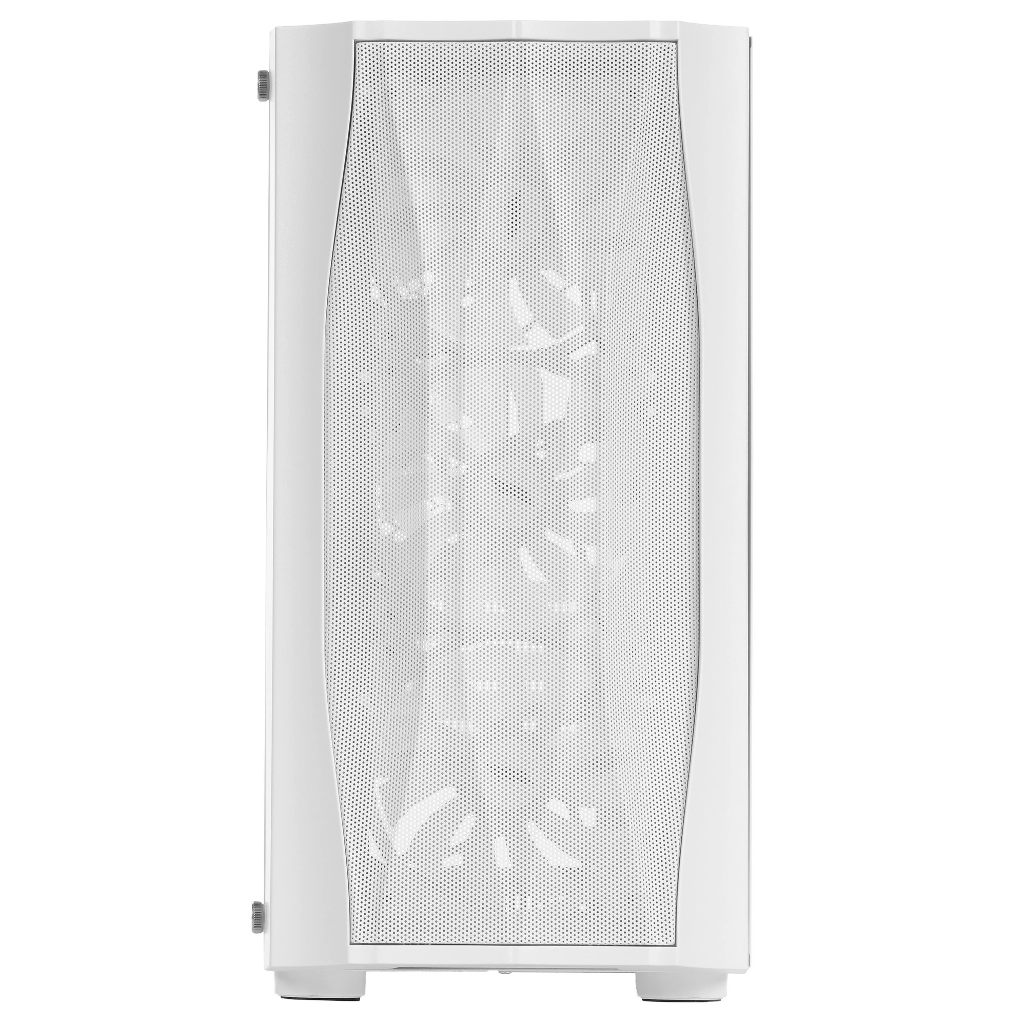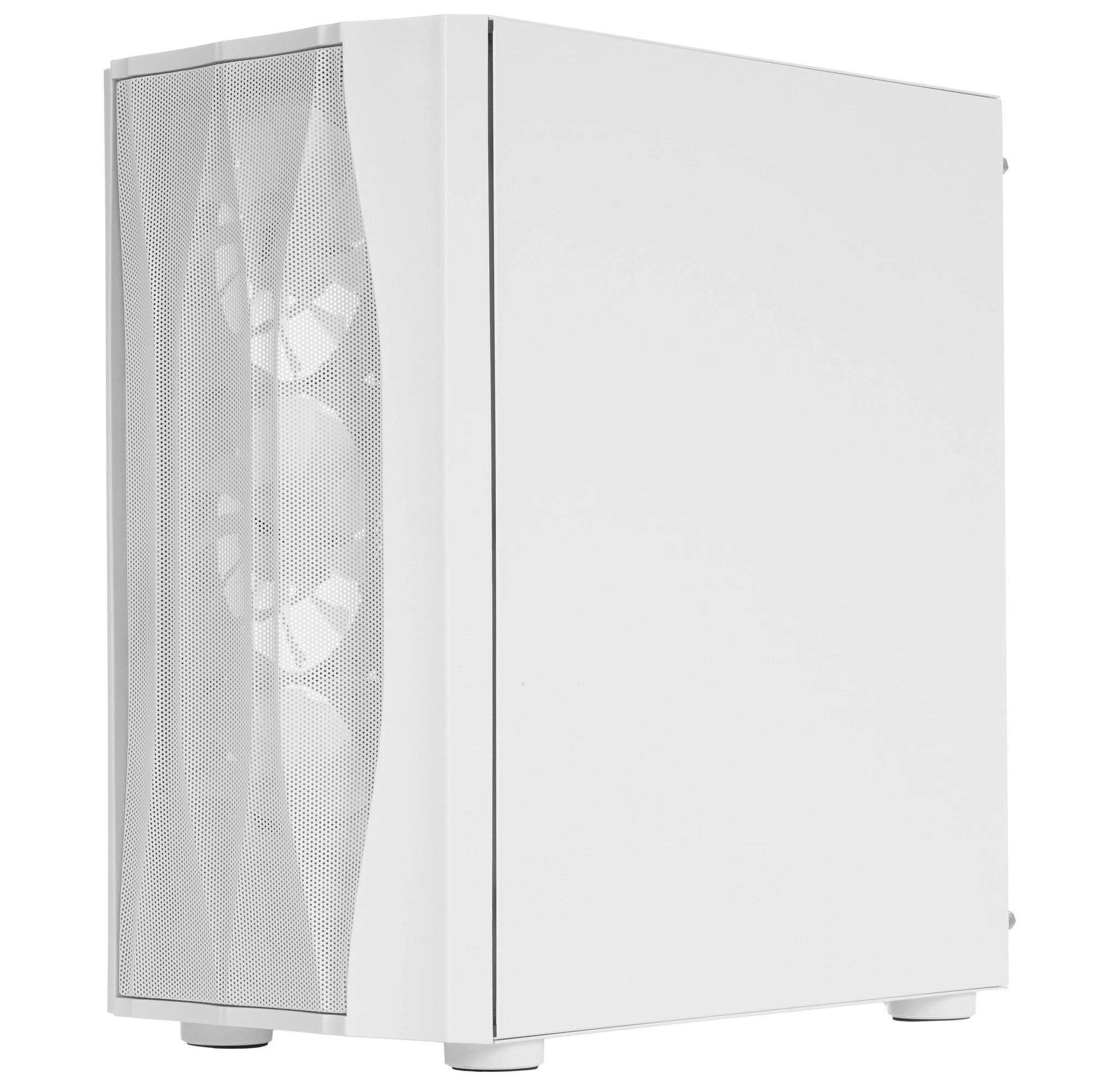 Корпус с дизайном в белом цвете рассчитан на сборку компактного игрового или универсального ПК. Модель форм-фактора Mini-Tower с габаритами 388x210x423 мм оснащена боковым окном из закаленного стекла и 4 вентиляторами с подсветкой FRGB. Прокладка кабелей за задней стенкой улучшает организацию внутреннего пространства системного блока. Специальный вырез обеспечивает возможность установки процессорного кулера с использованием бэкплейта при смонтированной системной плате. Источник питания не входит в оснащение модели. Пользователю потребуется БП форм-фактора ATX. Подключение периферийных устройств упрощено благодаря наличию 3 портов USB Type-A.