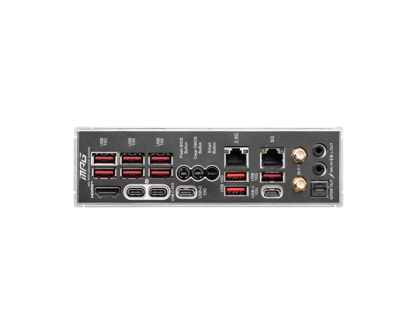 2.5G LAN,Wi-Fi / Bluetooth,Audio Connectors,HDMI,Flash BIOS Button,Clear CMOS Button,Optical S/PDIF OUT,USB 10Gbps Type-A,5G LAN,USB 40Gbps Type-C,USB 10Gbps Type-C,Smart Button