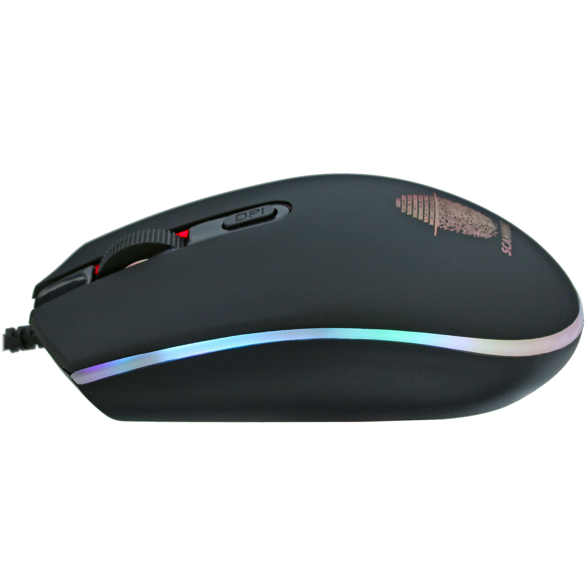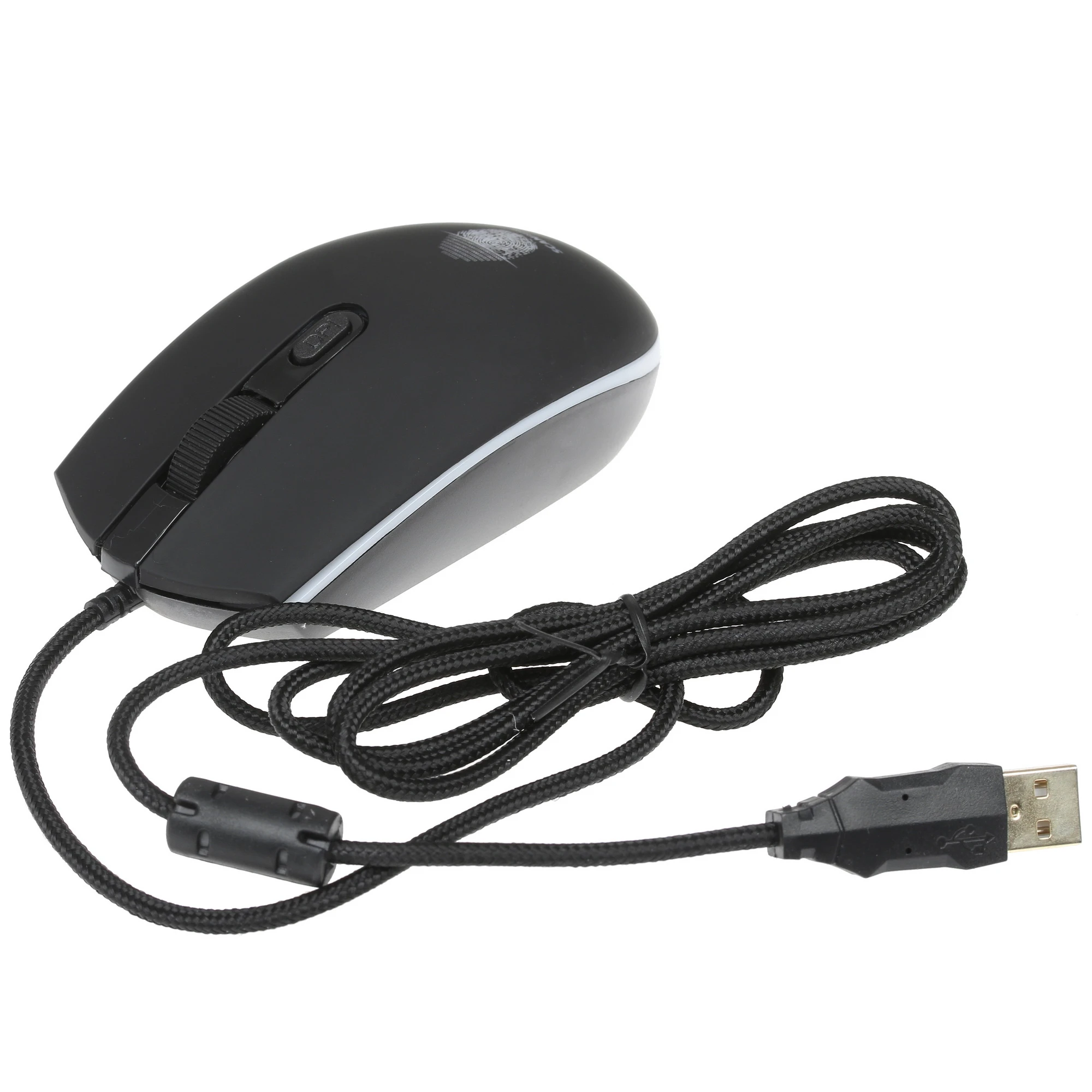 Мышь проводная имеет эффектный дизайн и многоцветную RGB-подсветку. Устройство обладает 4 кнопками, включая клавишу переключения разрешения в пределах до 3200 dpi. Модель изготовлена из матового нескользящего пластика. Ее достоинство заключается также в том, что она может использоваться и правой, и левой рукой. Мышь получает по шине питание, для чего она оснащена 1.5-метровым проводом в стальной оплетке. Подключается к ПК модель с использованием позолоченного коннектора USB. Особое достоинство компьютерной мыши – наличие фильтра магнитных помех.