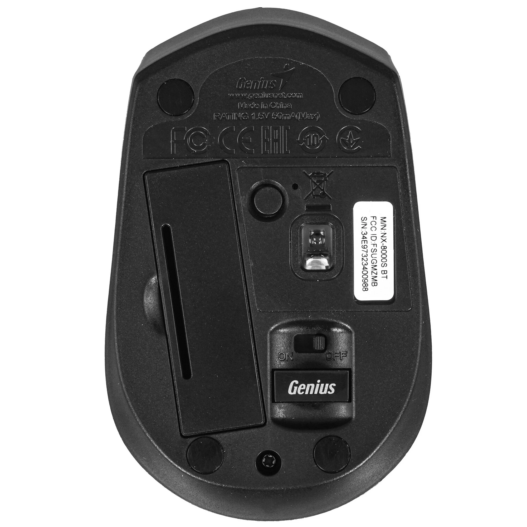 Мышь беспроводная удобна для управления правой и левой ладонью. Пластиковый корпус модели имеет матовое покрытие, на котором не остается следов от пальцев. При синхронизации аксессуара используется Bluetooth-интерфейс. Особенность Genius NX-8000S BT заключается в возможности переключения между 3 устройствами. Главным звеном выступает оптический светодиодный сенсор BlueEye, который гарантирует точное наведение курсора и плавное скольжение манипулятора даже без использования коврика. Конфигурацией предусмотрено 3 кнопки, не издающих клика во время нажатия. Для автономной работы требуется установка батарейки типа АА.
