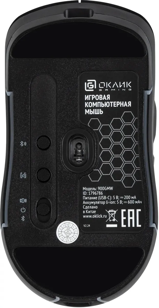 ышь Оклик 900GMW сочетает передовые технологии и эргономичный дизайн для комфорта и точности во время игры. Беспроводное подключение через Bluetooth 5.1 или USB-A ресивер 2.4 ГГц позволяет свободно перемещаться в радиусе 10 метров. Проводной режим обеспечивает надежное подключение благодаря кабелю в прочной оплетке. Позолоченный коннектор улучшает качество передачи сигнала, а встроенный ферритовый фильтр снижает уровень электромагнитных помех, обеспечивая плавную и точную работу мыши. Сенсор Pixart 3395 с диапазоном DPI от 1200 до 26000 передает каждое движение с высокой точностью, частота опроса 1000 Гц и ускорение 50G обеспечивают молниеносный отклик, а движения мыши плавными и точными. Ресурс в 50 млн кликов позволяет мыши выдерживать длительные игровые сессии, что будет полезно для активных геймеров. Легкий корпус весом 90 граммов снижает нагрузку на руку, а сменные магнитные панели позволяют использовать устройство в двух форм-факторах. Дополнительная съемная панель с перфорацией в виде сот снижает вес устройства и улучшает естественную вентиляцию, что подойдет игрокам, предпочитающим ладонный хват. Такое решение позволяет настроить мышь под индивидуальные предпочтения и поддерживать комфорт в течение игровых сессий.Матовое покрытие Soft Touch предотвращает скольжение руки, прорезиненное колесо делает прокрутку более плавной, а тефлоновые ножки снижают нагрузку на запястье. RGB-подсветка с девятью режимами, тремя уровнями яркости и пятью скоростями создает яркие визуальные эффекты, которые можно настраивать по яркости и скорости смены цветов, создавая уникальную атмосферу на рабочем месте или в игре.