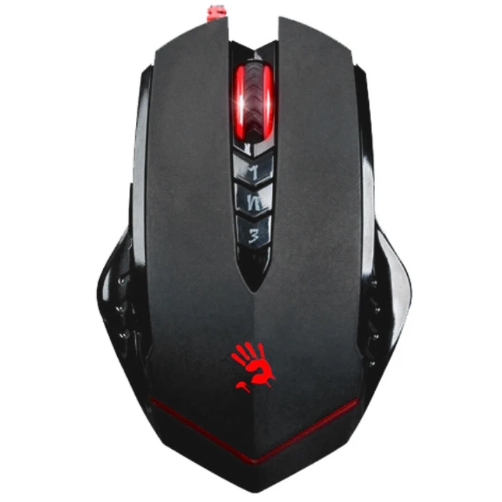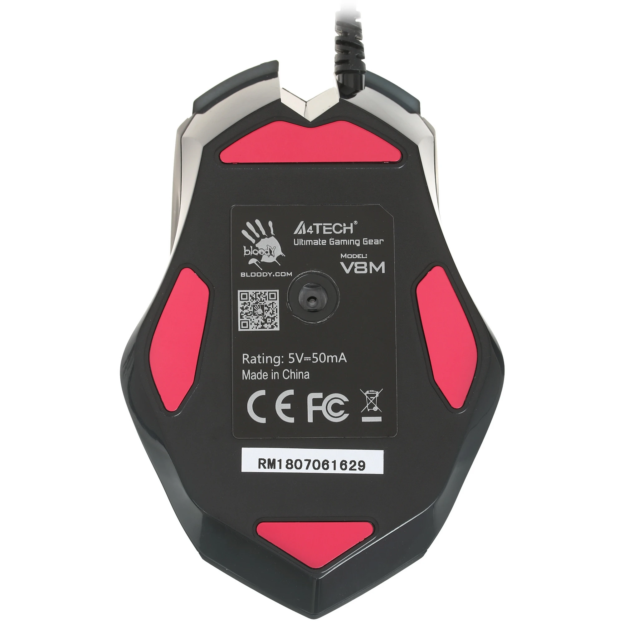 Проводная мышь A4Tech Bloody V8 – игровая модель с широким набором возможностей и креативным дизайном. Стильный корпус под правую и левую руку изготовлен из черного пластика с матовым Soft-touch покрытием. Подключается с помощью кабеля с оплеткой через интерфейс USB, длина провода составляет 1.8 м. Габариты 82х42x123 мм и вес 140 г делают мышь удобной в использовании, а металлические ножки легко и комфортно скользят по поверхности. Для более точного управления предусмотрены 8 кнопок (включая колесико), 5 из которых являются программируемые.