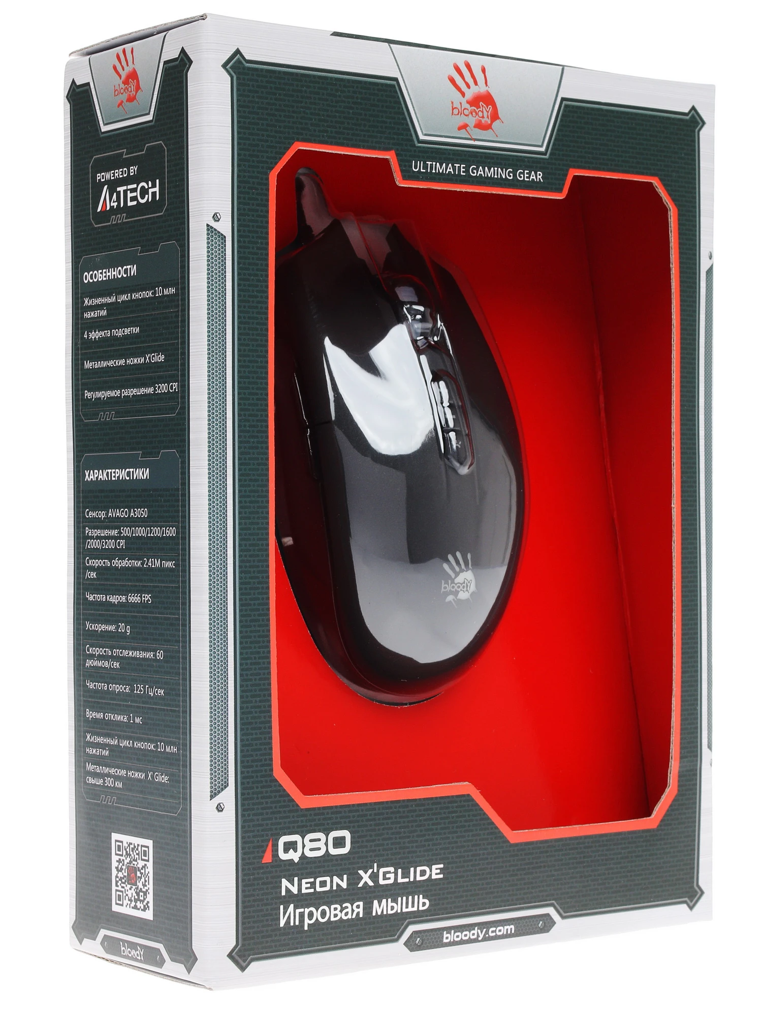Мышь проводная A4Tech Q80, оформленная в стиле Bloody, отличается от других наличием металлических ножек, которые истираются гораздо дольше, чем обычные пластиковые, и обеспечивают лучшее скольжение. Устройство предназначено для игровых ситуаций, поэтому оборудовано 8 кнопками, среди которых есть программируемые, и имеет возможность переключения чувствительности сенсора – каждый геймер может настроить его под себя. A4Tech Q80 одинаково хорошо подходит для левой и правой руки. Многоцветная подсветка делает ее настоящим украшением рабочего места, а подключается мышь через провод с USB-разъемом.