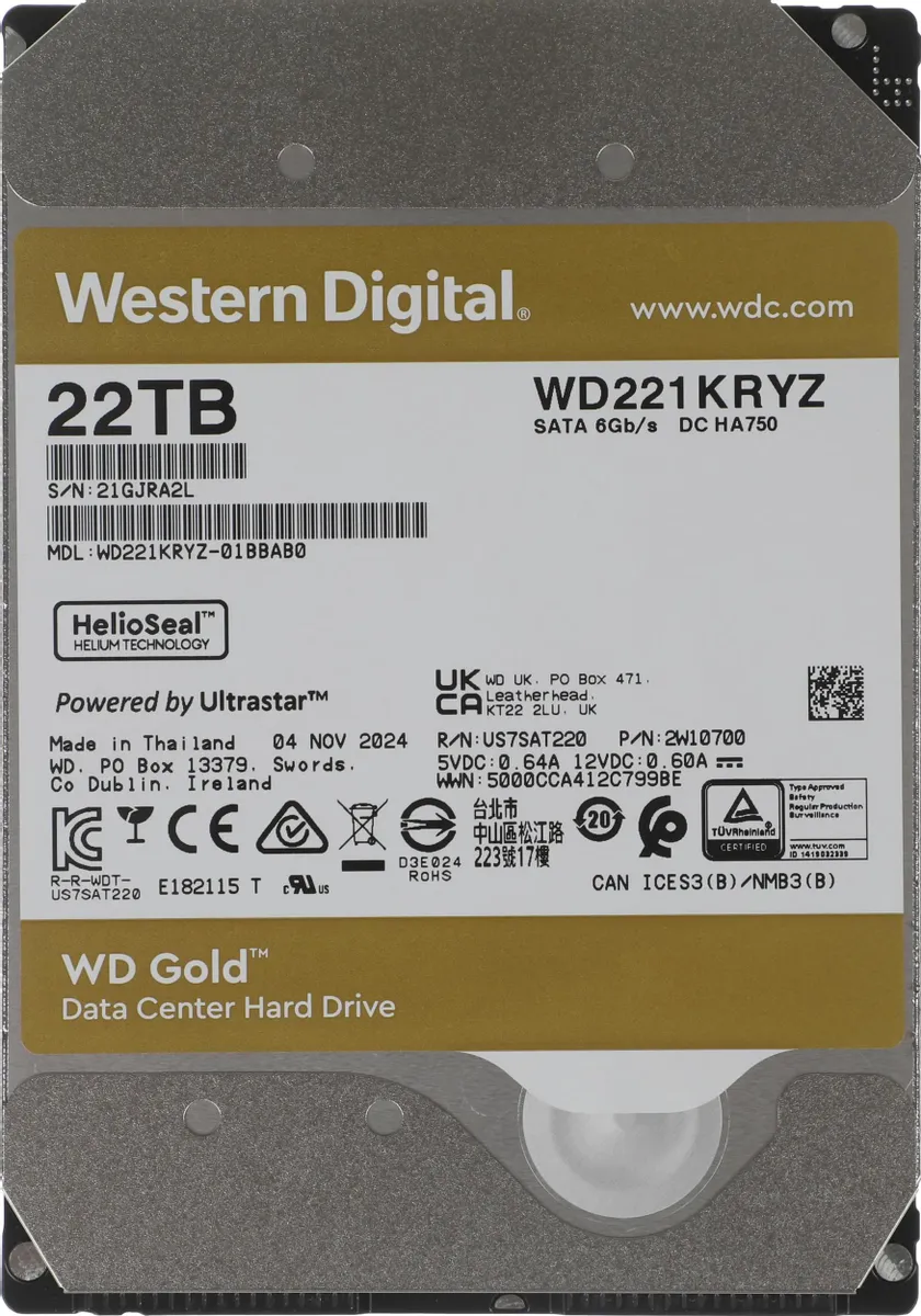 Жесткий диск Western Digital GOLD WD221KRYZ 22TB 3.5" 7200 RPM 512MB 512e SATA-III [WD221KRYZ]
