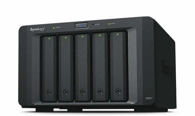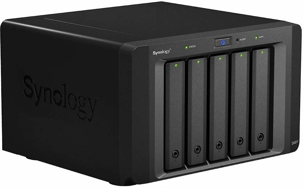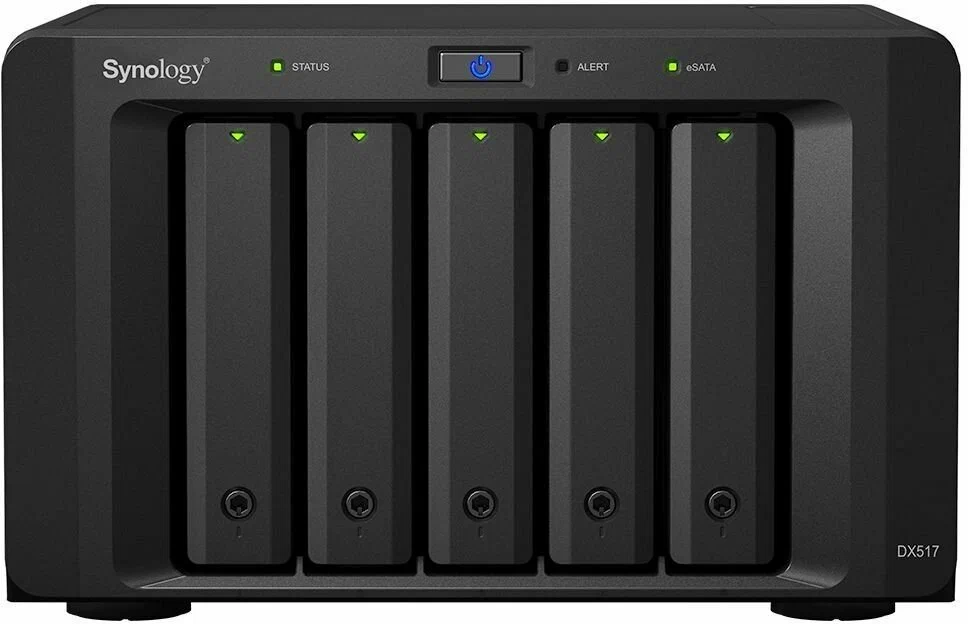 Модуль расширения для сетевого хранилища Synology DX517 подходит для размещения колоссального объема информации – до 50 ТБ. Для этого он имеет в своей конструкции отсеки 5 накопителей типа SATA II / III или SSD по 10 ТБ каждый. Еще один плюс этого устройства – возможность горячей замены HDD. Чтобы обеспечить ему долгую работоспособность, производитель оснастил его встроенной системой охлаждения. Модуль расширения для сетевого хранилища Synology DX517 занимает немного места на рабочем столе, поэтому его можно сделать мини-сервером для домашнего или рабочего офиса.